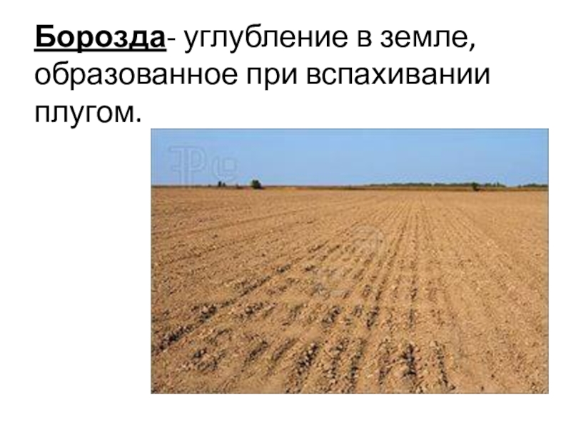 Слайд 13Борозда- углубление в земле, образованное при вспахивании плугом.