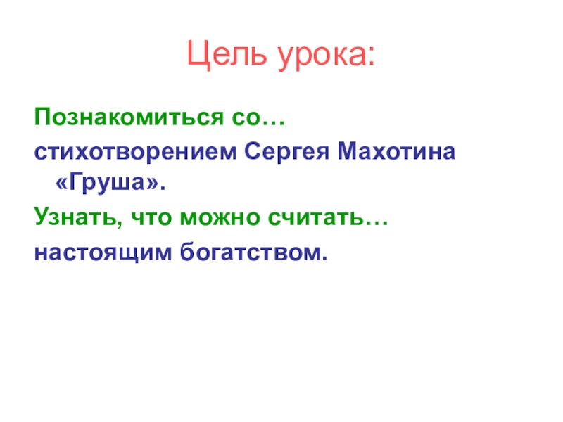 Цель урока:Познакомиться со…стихотворением Сергея Махотина «Груша».Узнать, что можно считать…настоящим богатством.