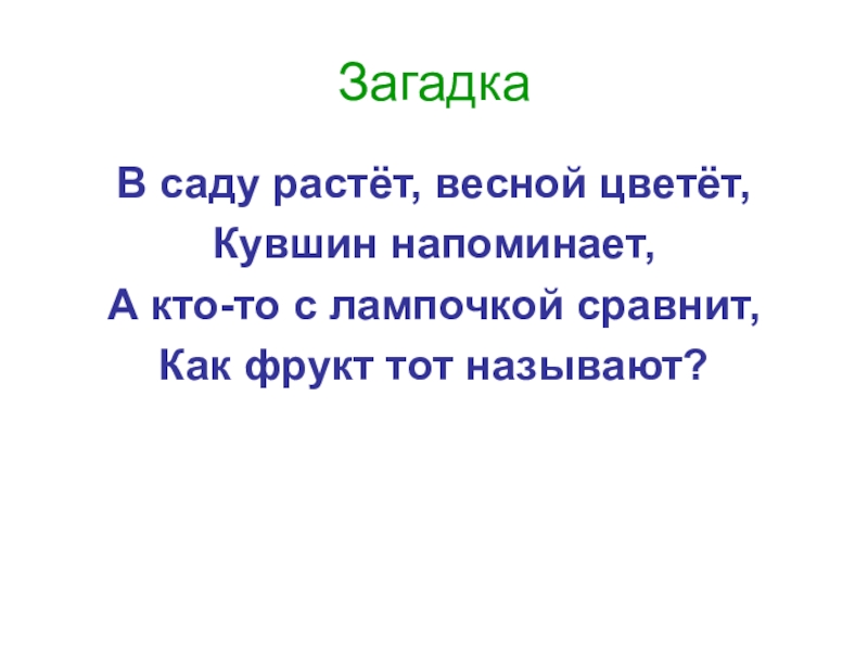 ЗагадкаВ саду растёт, весной цветёт,Кувшин напоминает,А кто-то с лампочкой сравнит,Как фрукт тот называют?