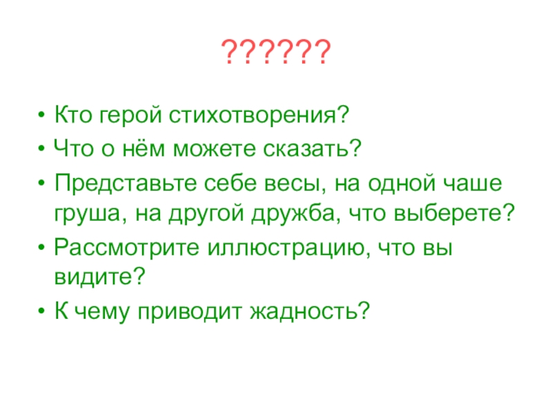 ??????Кто герой стихотворения?Что о нём можете сказать?Представьте себе весы, на одной чаше груша, на другой дружба, что