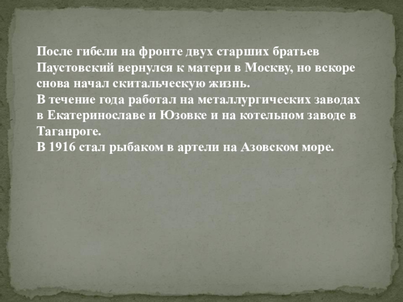 После гибели на фронте двух старших братьев Паустовский вернулся к матери в Москву, но вскоре снова начал скитальческую жизнь.