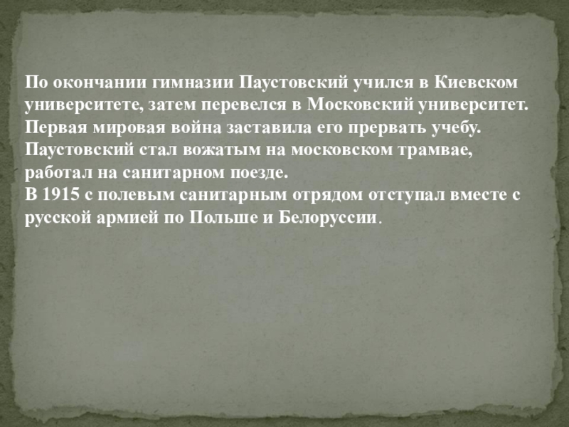 По окончании гимназии Паустовский учился в Киевском университете, затем перевелся в Московский университет.