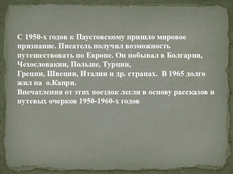 С 1950-х годов к Паустовскому пришло мировое признание. Писатель получил возможность путешествовать по Европе. Он побывал в Болгарии, Чехословакии, Польше, Турции,