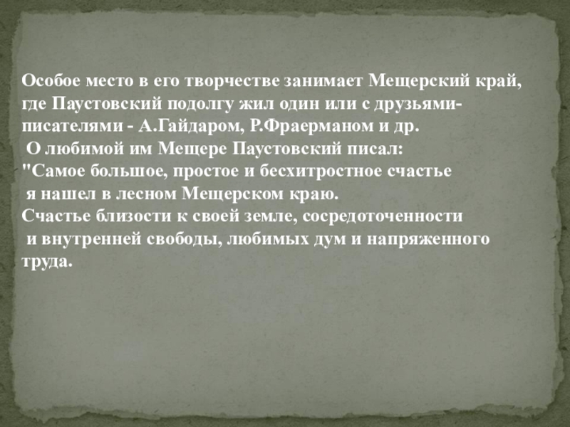 Особое место в его творчестве занимает Мещерский край, где Паустовский подолгу жил один или с друзьями-писателями - А.Гайдаром, Р.Фраерманом и др.