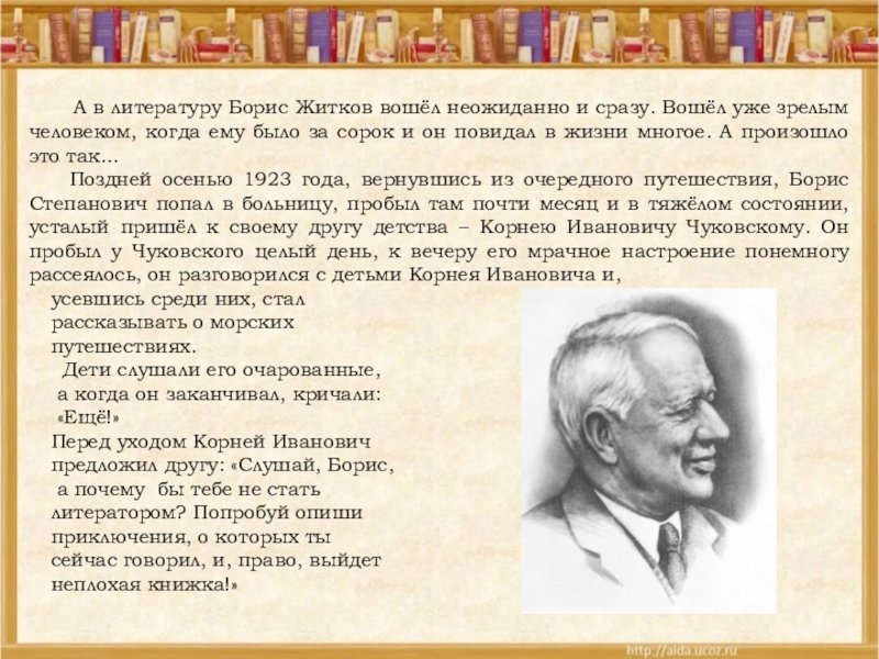Слайд 8 А в литературу Борис Житков вошёл неожиданно и сразу.