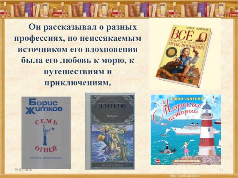Слайд 11Он рассказывал о разных профессиях, но неиссякаемым источником его вдохновения была