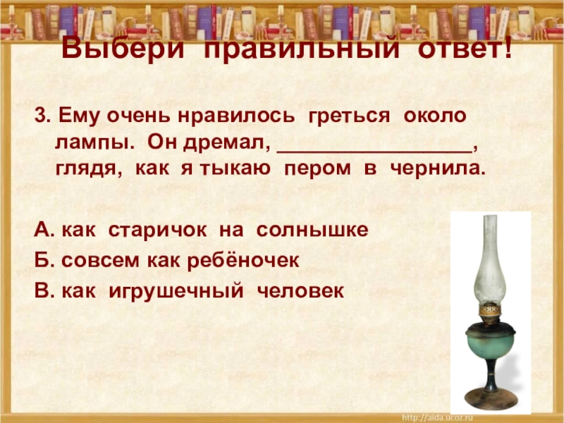 3. Ему очень нравилось греться около лампы. Он дремал,