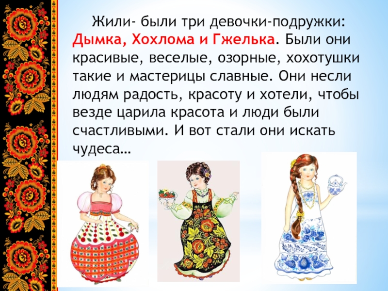 Жили- были три девочки-подружки: Дымка, Хохлома и Гжелька. Были они красивые, веселые, озорные, хохотушки такие и мастерицы славные. Они несли людям радость, красоту и хотели, чтобы везде царила красота и люди были счастливыми. И вот стали