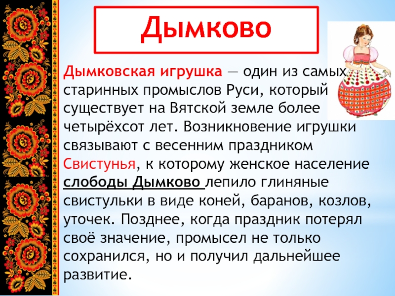 ДымковоДымковская игрушка — один из самых старинных промыслов Руси, который существует на Вятской земле более четырёхсот лет. Возникновение