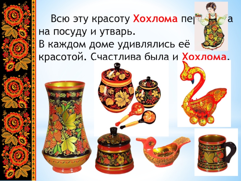 Всю эту красоту Хохлома перенесла на посуду и утварь. В каждом доме удивлялись её красотой. Счастлива была