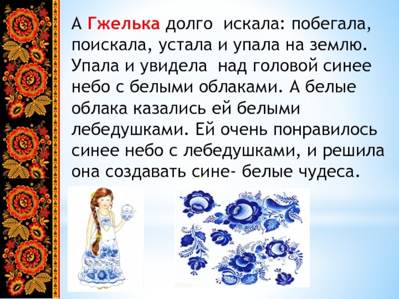 Слайд 7А Гжелька долго искала: побегала, поискала, устала и упала на землю.