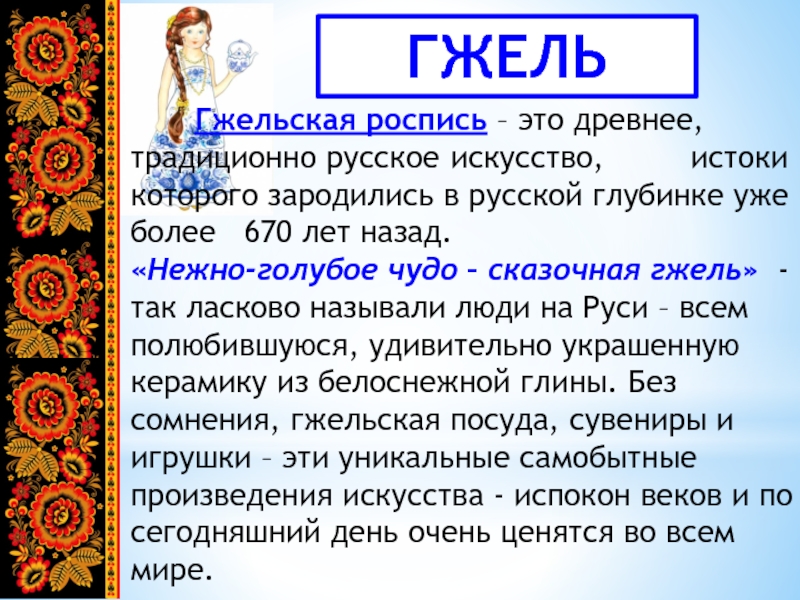 ГЖЕЛЬ	  Гжельская роспись – это древнее, 			традиционно русское 	искусство, 		истоки которого зародились в русской глубинке уже более