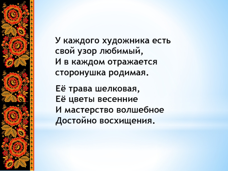 Её трава шелковая, Её цветы весенние И мастерство волшебноеДостойно восхищения. У каждого художника есть свой узор любимый,И