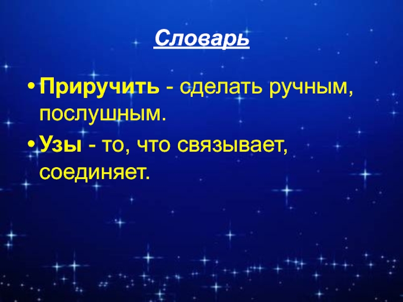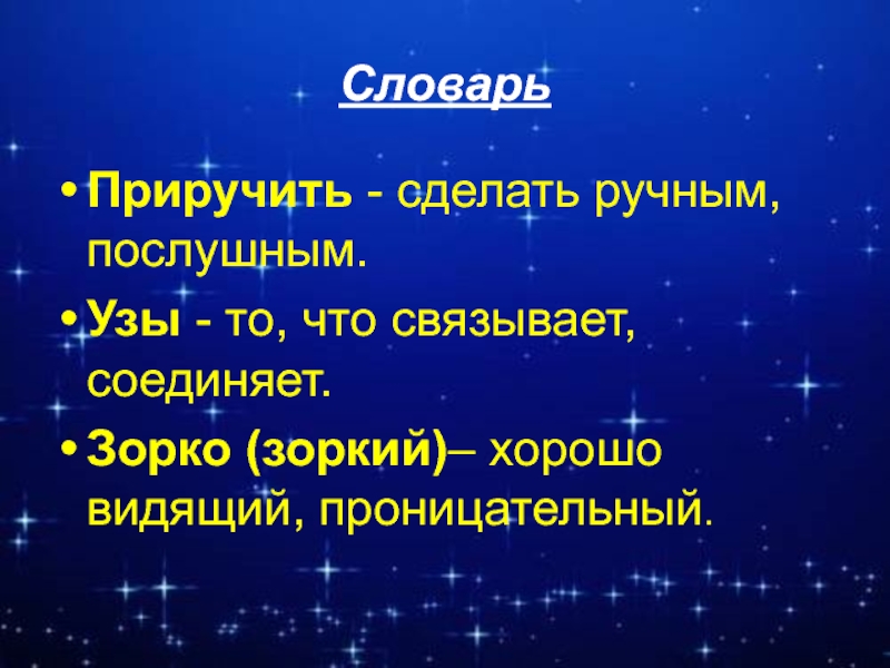 СловарьПриручить - сделать ручным, послушным.Узы - то, что связывает, соединяет.Зорко (зоркий)– хорошо видящий, проницательный.