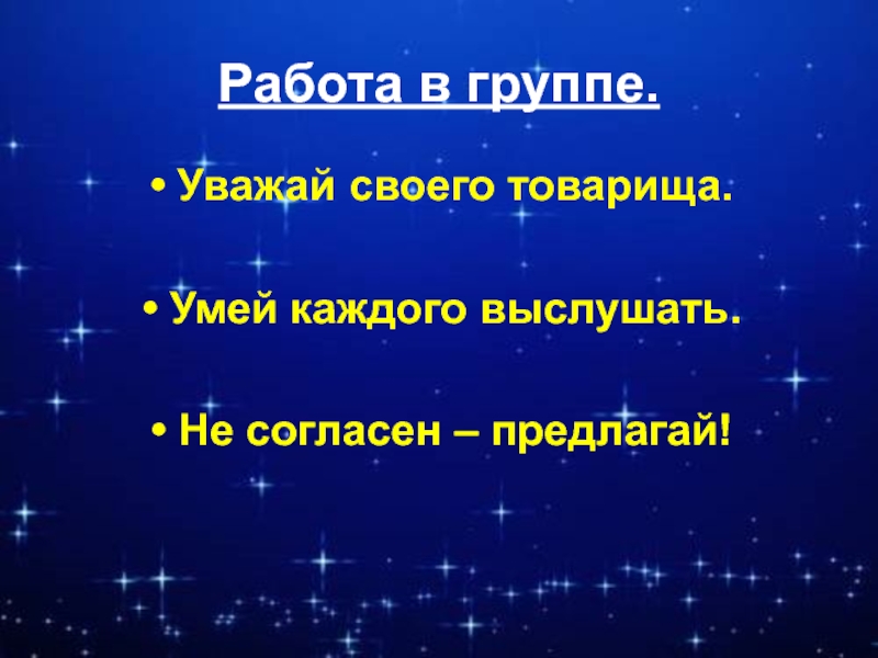 Работа в группе.Уважай своего товарища.Умей каждого выслушать.Не согласен – предлагай!