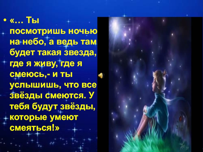 звезда, где я живу, где я смеюсь,- и ты услышишь, что все звёзды смеются. У тебя будут звёзды, которые умеют смеяться!»
