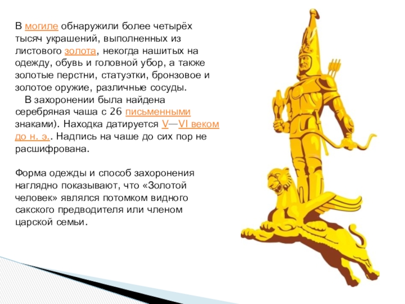 Слайд 2«Золото́й челове́к» (каз. Алтын Адам) — условное название археологической находки[, сделанной в