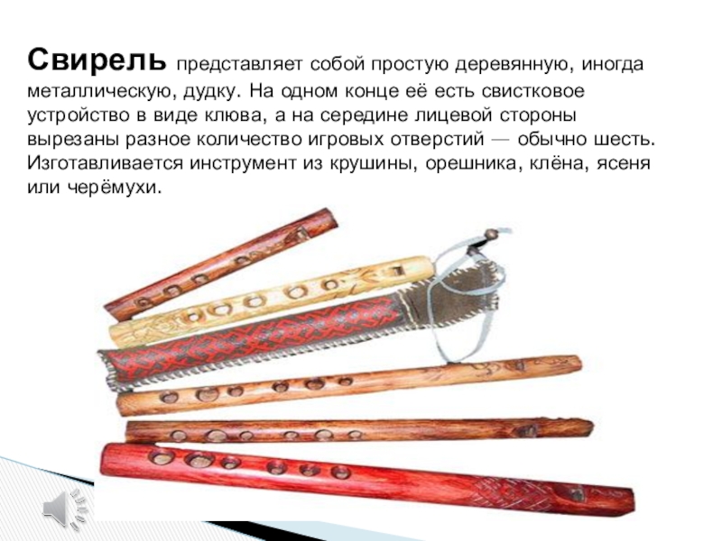 Слайд 6Свирель представляет собой простую деревянную, иногда металлическую, дудку. На одном конце