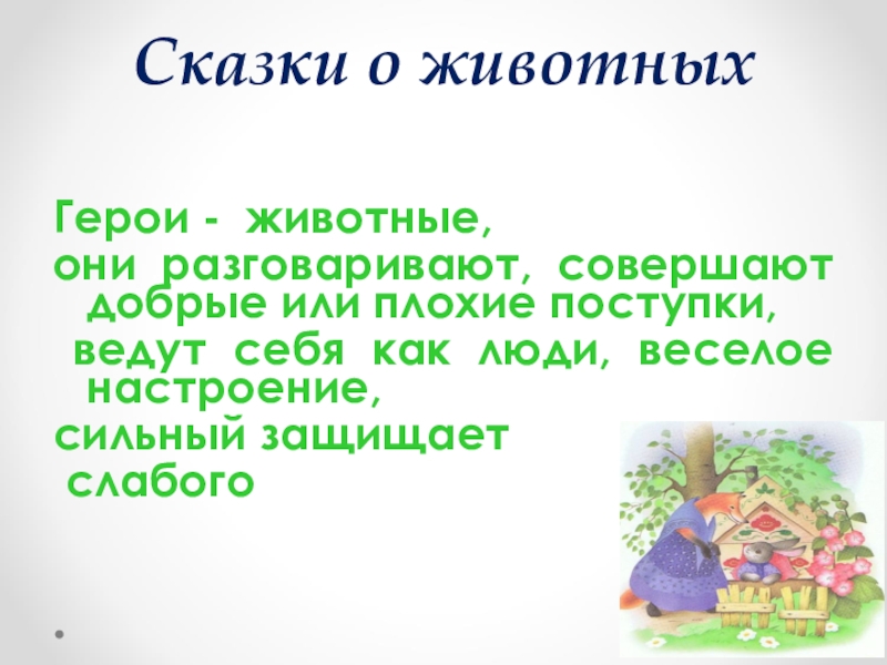Сказки о животныхГерои - животные, они разговаривают, совершают добрые или плохие поступки, ведут себя как люди, веселое