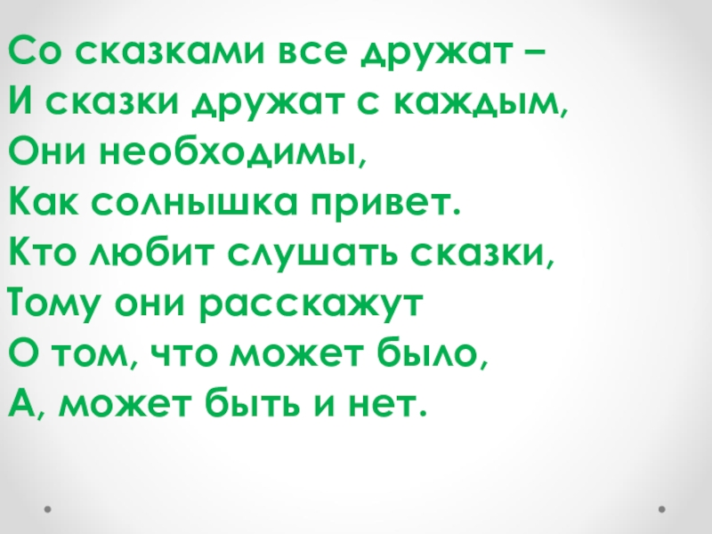 Со сказками все дружат –И сказки дружат с каждым,Они необходимы,Как солнышка привет.Кто любит слушать сказки,Тому они расскажутО том, что может было,А, может быть и нет.