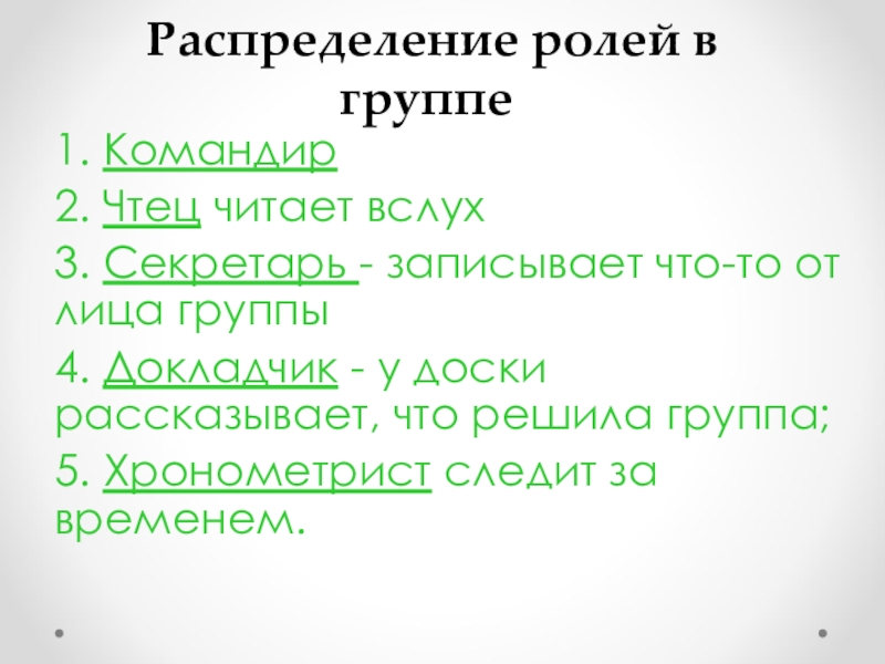 Распределение ролей в группе1. Командир2. Чтец читает вслух3. Секретарь - записывает что-то от лица группы4. Докладчик