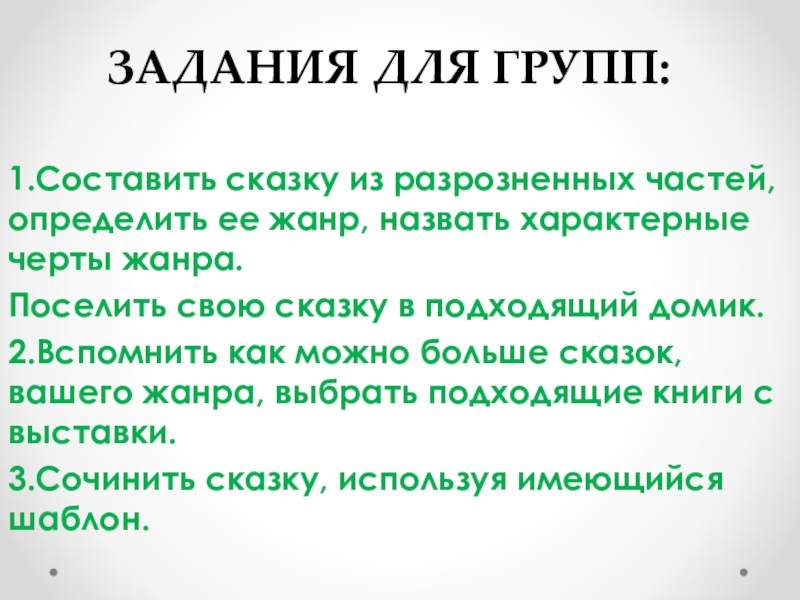ЗАДАНИЯ ДЛЯ ГРУПП:1.Составить сказку из разрозненных частей, определить ее жанр, назвать характерные черты жанра.Поселить свою сказку в