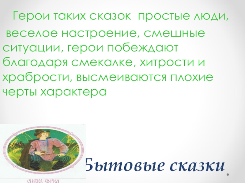 Бытовые сказки  Герои таких сказок простые люди,  веселое настроение, смешные ситуации, герои побеждают благодаря смекалке,