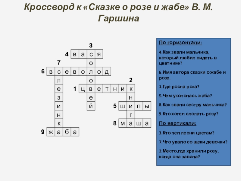 Кроссворд к «Сказке о розе и жабе» В. М.Гаршина