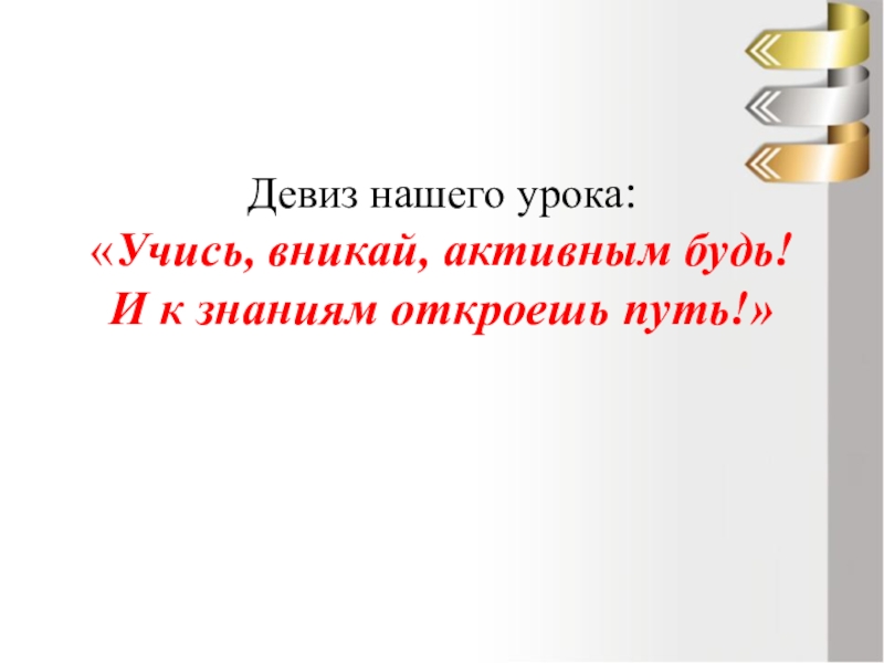 Слайд 1Девиз нашего урока: «Учись, вникай, активным будь! И к знаниям откроешь путь!»