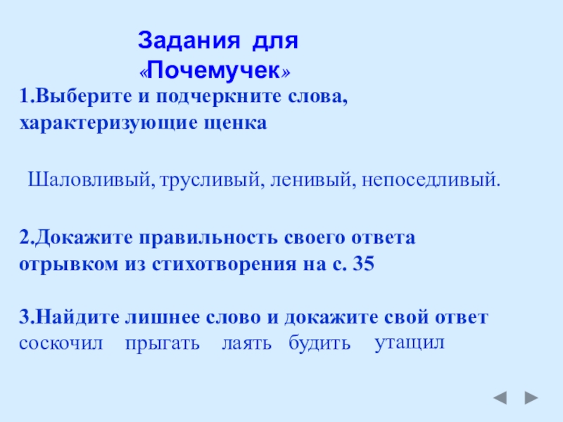 1.Выберите и подчеркните слова, характеризующие щенка