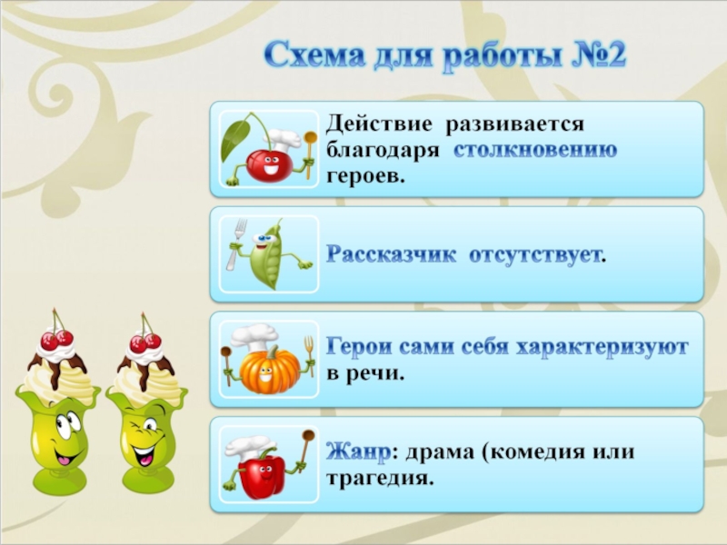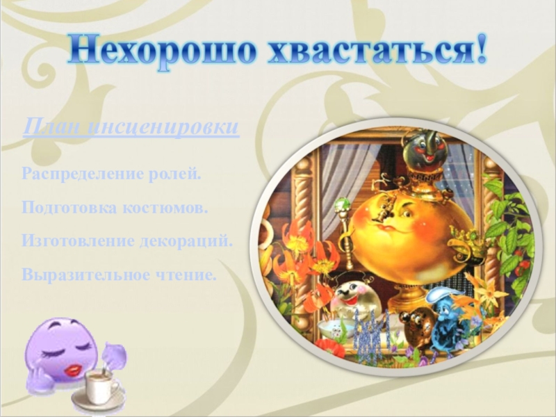 План инсценировкиРаспределение ролей. Подготовка костюмов.Изготовление декораций.Выразительное чтение.