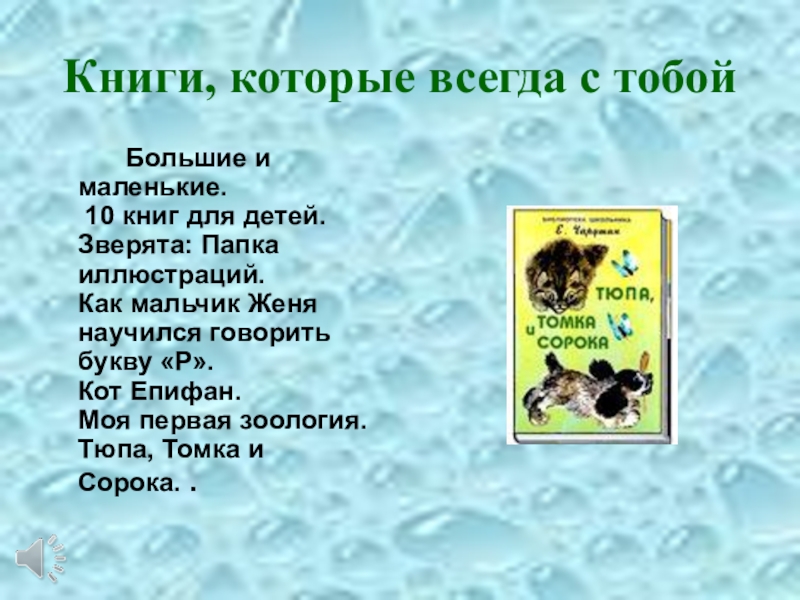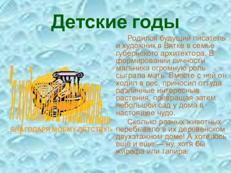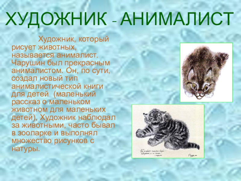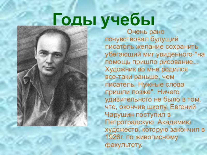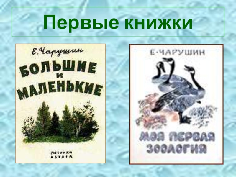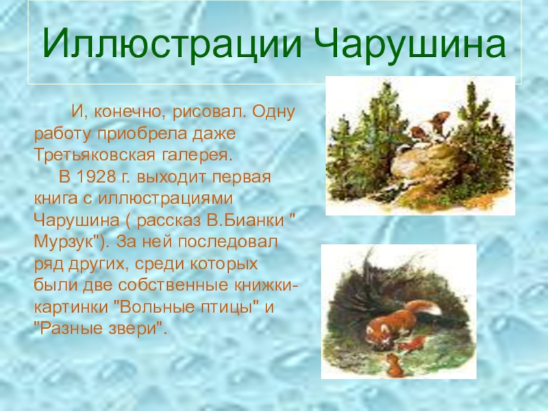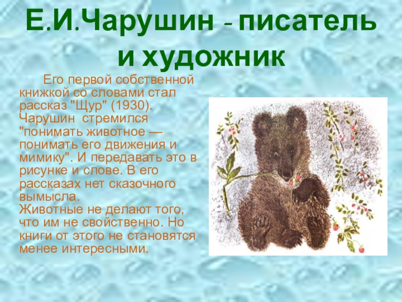 Другое дело — рисунки. Чарушин рос, по собственному определению,"с карандашом и кистью в руках". А на рисунках его чаще всего были все те же собаки, медведи и прочие замечательные звери.