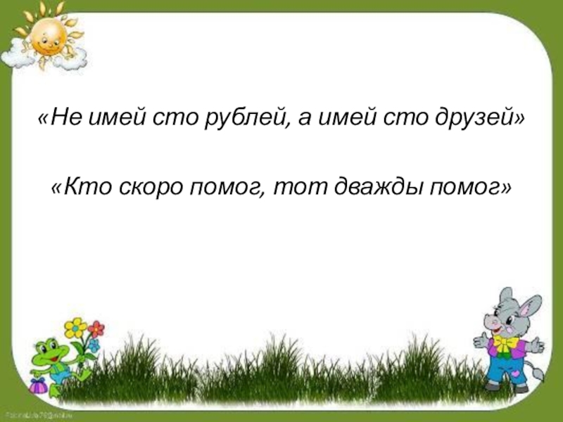 «Не имей сто рублей, а имей сто друзей»«Кто скоро помог, тот дважды помог»