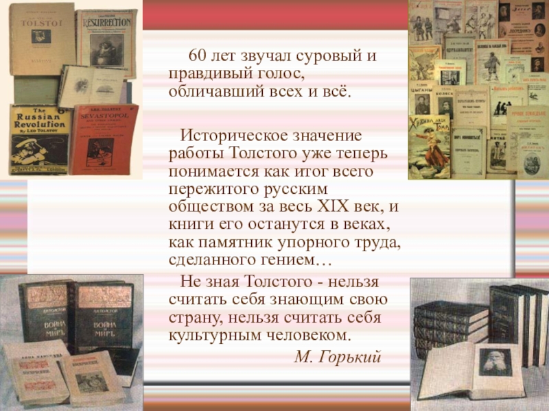 Историческое значение работы Толстого уже теперь понимается как итог всего пережитого русским обществом за весь ХIX век, и книги его останутся в веках, как памятник упорного труда, сделанного гением…