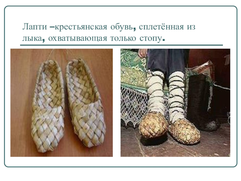 Слайд 8Лапти –крестьянская обувь, сплетённая из лыка, охватывающая только стопу.