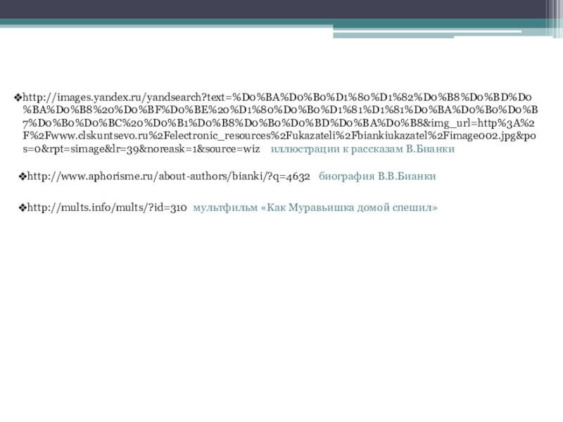 Слайд 23http://images.yandex.ru/yandsearch?text=%D0%BA%D0%B0%D1%80%D1%82%D0%B8%D0%BD%D0%BA%D0%B8%20%D0%BF%D0%BE%20%D1%80%D0%B0%D1%81%D1%81%D0%BA%D0%B0%D0%B7%D0%B0%D0%BC%20%D0%B1%D0%B8%D0%B0%D0%BD%D0%BA%D0%B8&img_url=http%3A%2F%2Fwww.clskuntsevo.ru%2Felectronic_resources%2Fukazateli%2Fbiankiukazatel%2Fimage002.jpg&pos=0&rpt=simage&lr=39&noreask=1&source=wiz иллюстрации к рассказам В.Бианки