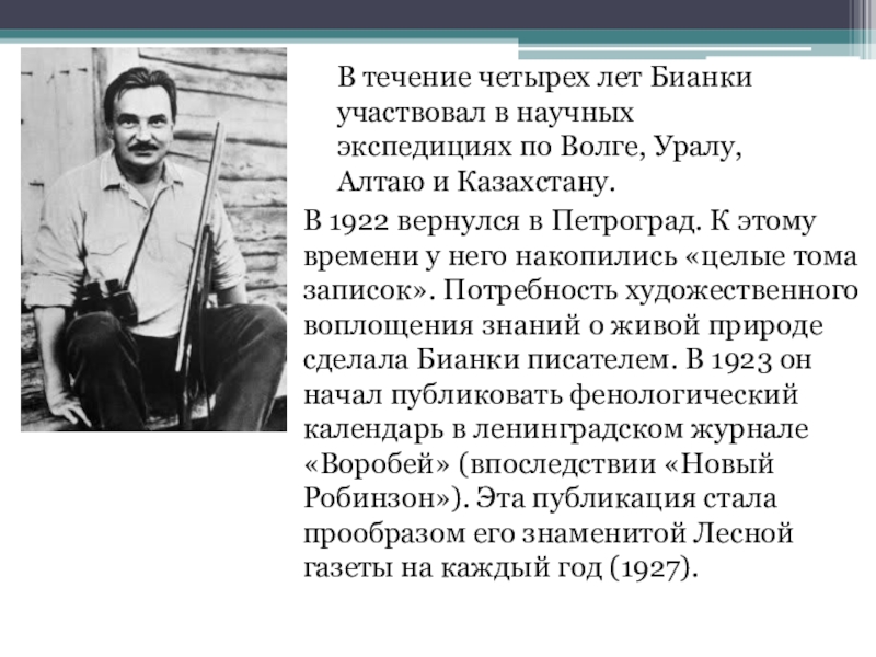 Слайд 5В течение четырех лет Бианки участвовал в научных экспедициях по Волге,