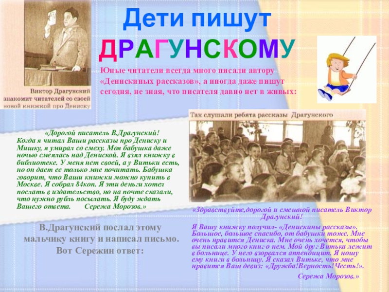 Когда я читал Ваши рассказы про Дениску и Мишку, я умирал со смеху. Моя бабушка даже ночью смеялась над Дениской. Я взял книжку в библиотеке. У меня нет своей, а у Витьки есть, но он дает ее только мне почитать. Бабушка говорит, что Ваши книжки можно купить в Москве. Я собрал 84коп. Я эти деньги хотел послать в издательство, но на почте сказали, что нужно рубль посылать. Я буду ждать Вашего ответа. Сережа Морозов.»
