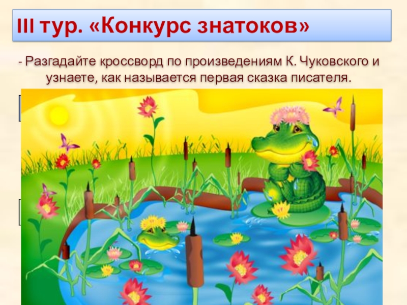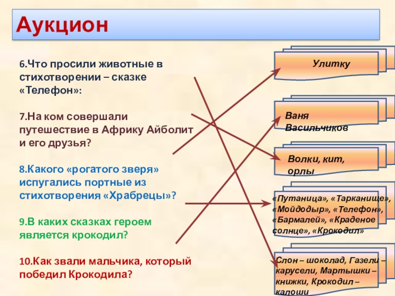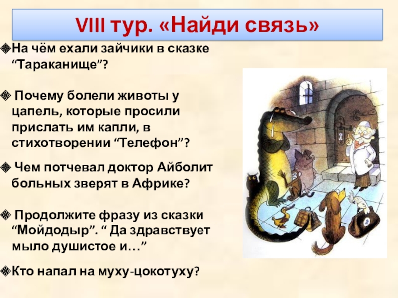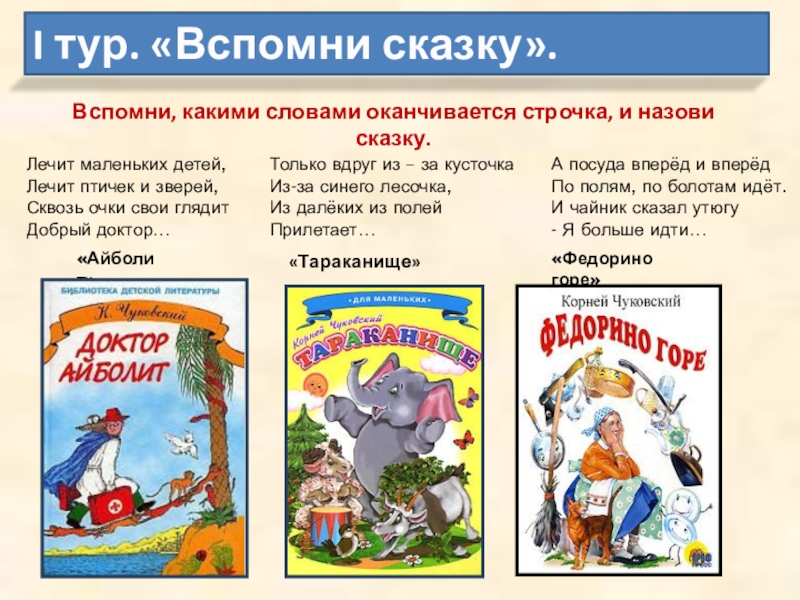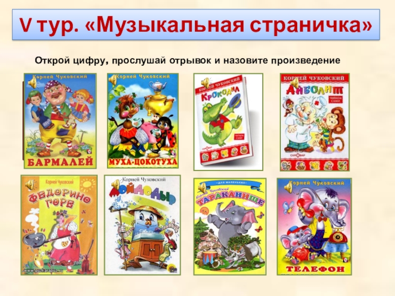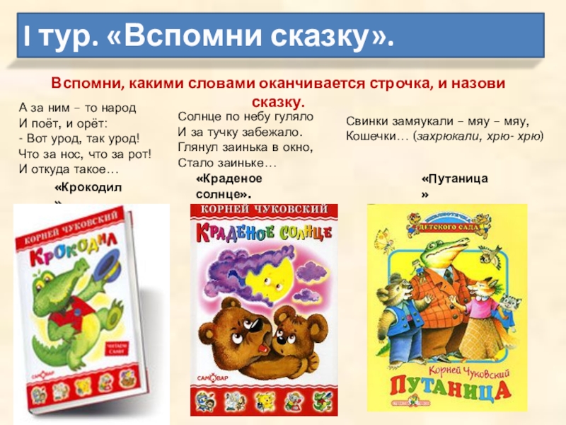 «Путаница», «Тарканище», «Мойдодыр», «Телефон», «Бармалей», «Краденое солнце», «Крокодил»
