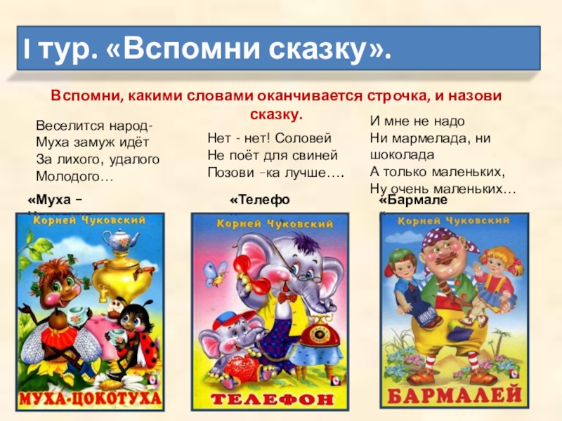 Вспомни, какими словами оканчивается строчка, и назови сказку.