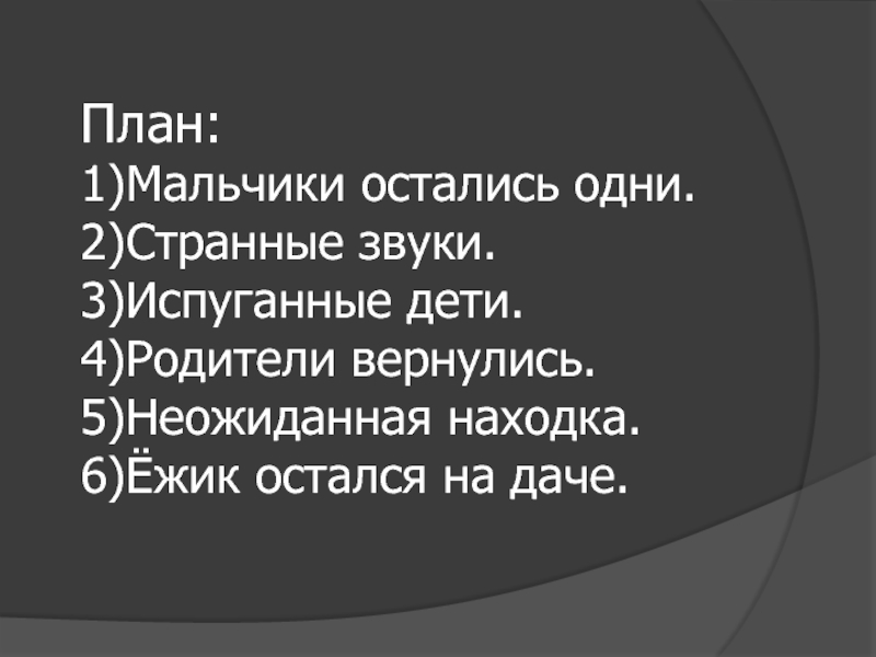 План:1)Мальчики остались одни.2)Странные звуки.3)Испуганные дети.4)Родители вернулись.5)Неожиданная находка.6)Ёжик остался на даче.