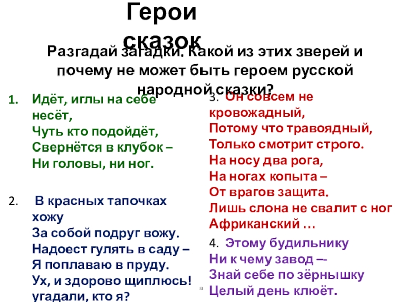 Разгадай загадки. Какой из этих зверей и почему не может быть героем русской народной сказки?