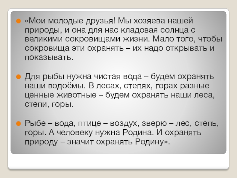 Слайд 9«Мои молодые друзья! Мы хозяева нашей природы, и она для нас