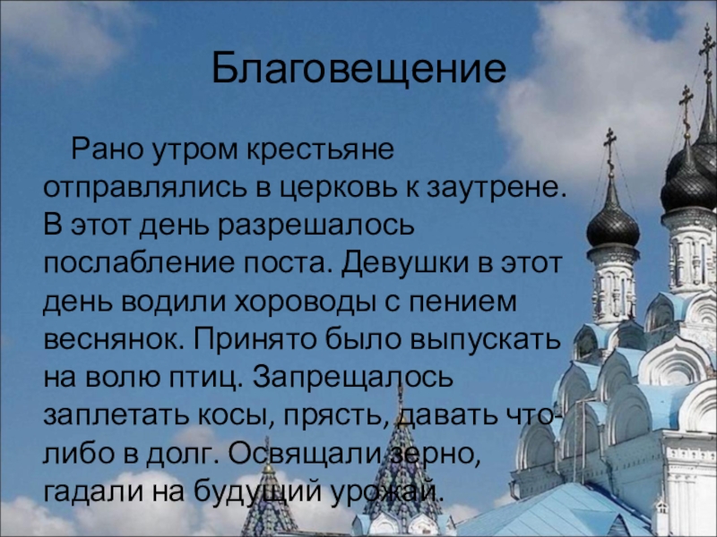 разрешалось послабление поста. Девушки в этот день водили хороводы с пением веснянок. Принято было выпускать на волю птиц. Запрещалось заплетать косы, прясть, давать что-либо в долг. Освящали зерно, гадали на будущий урожай.