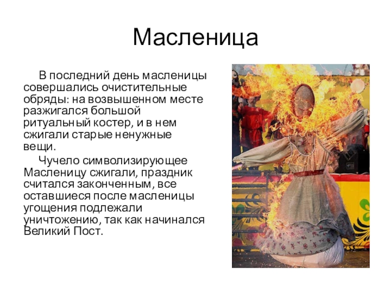 Чучело символизирующее Масленицу сжигали, праздник считался законченным, все оставшиеся после масленицы угощения подлежали уничтожению, так как начинался Великий Пост.