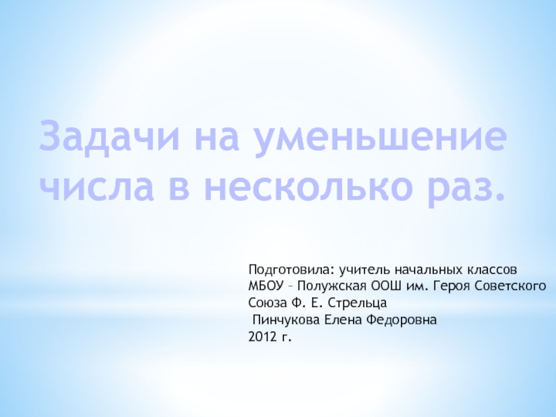 Задачи на уменьшение числа в несколько раз. Подготовила: учитель начальных классов МБОУ – Полужская ООШ им. Героя