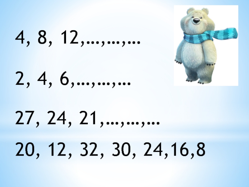 4, 8, 12,…,…,…2, 4, 6,…,…,…27, 24, 21,…,…,…20, 12, 32, 30, 24,16,8