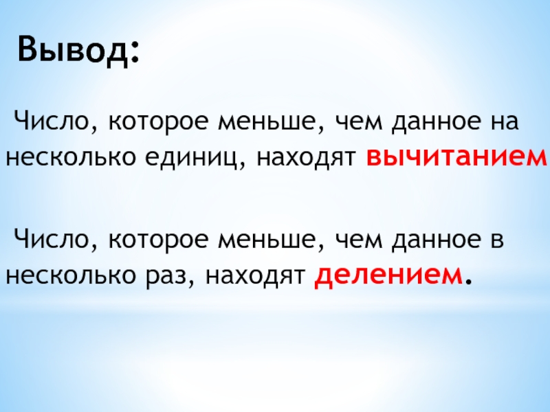 Вывод: Число, которое меньше, чем данное на несколько единиц, находят вычитанием. Число, которое меньше, чем данное в