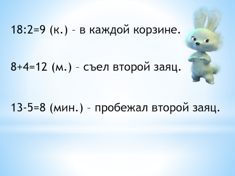 18:2=9 (к.) – в каждой корзине.8+4=12 (м.) – съел второй заяц.13-5=8 (мин.) – пробежал второй заяц.