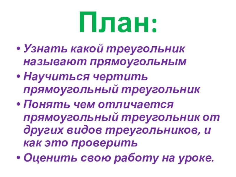 План:Узнать какой треугольник называют прямоугольным Научиться чертить прямоугольный треугольникПонять чем отличается прямоугольный треугольник от других видов треугольников,